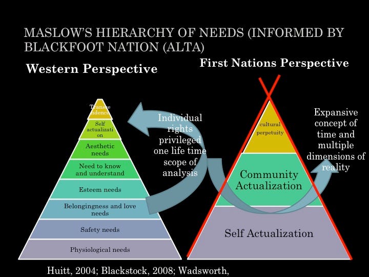 Abraham Maslow, a prominent humanist psychologist, introduced the hierarchy of needs in his 1943 paper “A Theory of Human Motivation.” This pyramid-shaped model (which wasn’t specifically detailed as a pyramid by Maslow) outlines the stages of human needs, culminating in self-actualization at the top. For the Blackfoot people, self-actualization is actually at the bottom of the tipi (pyramid) and community-actualization is at the top.